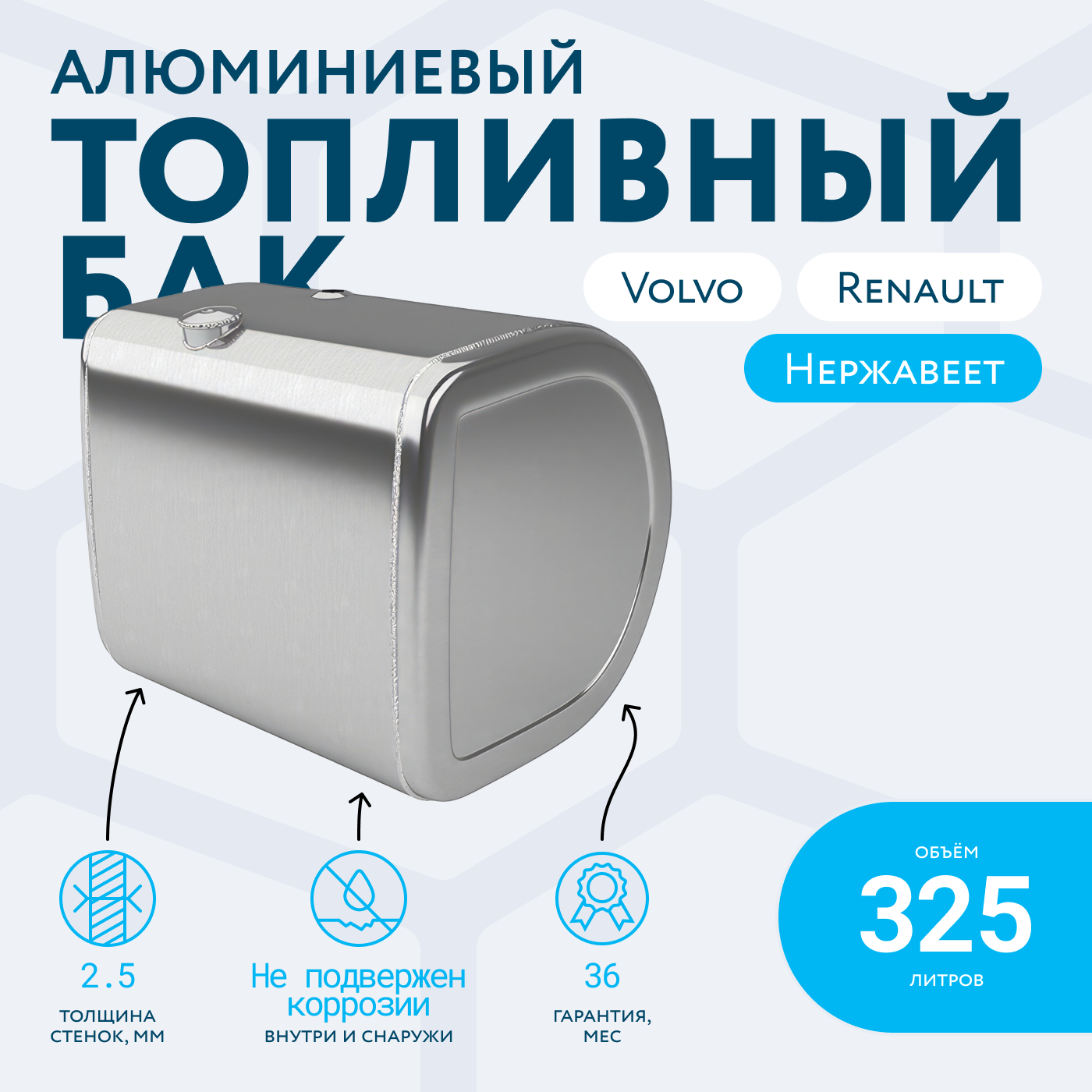 Наши алюминиевые баки изготовлены из алюминия АМг3 увеличенной толщины 2.5 мм. Однако мы можем изготовить топливный бак для вашего грузового авто из алюминия 3 мм под заказ. Обратите внимание! Заказная позиция требует увеличения стоимости и срока производства бака.