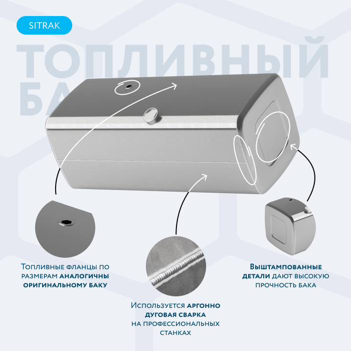 Топливный бак нашего производства изготовлен из сортового алюминия увеличенной толщины 2.5 мм. Для дополнительного усиления прочности бак оснащен ребрами жесткости в виде трех внутренних перегородок, приваренных по периметру, основная функция которых — это обеспечение плавного перетекания топлива и нейтрализации гидроударов.